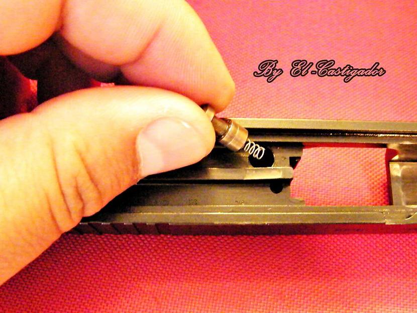 Ya con el tetón en su alojamiento procedemos a presionarlo en su alojamiento de la forma que se ve en las fotos para poder ubicar la uña extractora en su sitio y que al dejar de presionar el tetón este por la fuerza del muelle que lleva presione la uña extractora evitando que la misma se puede desprender de la corredera.