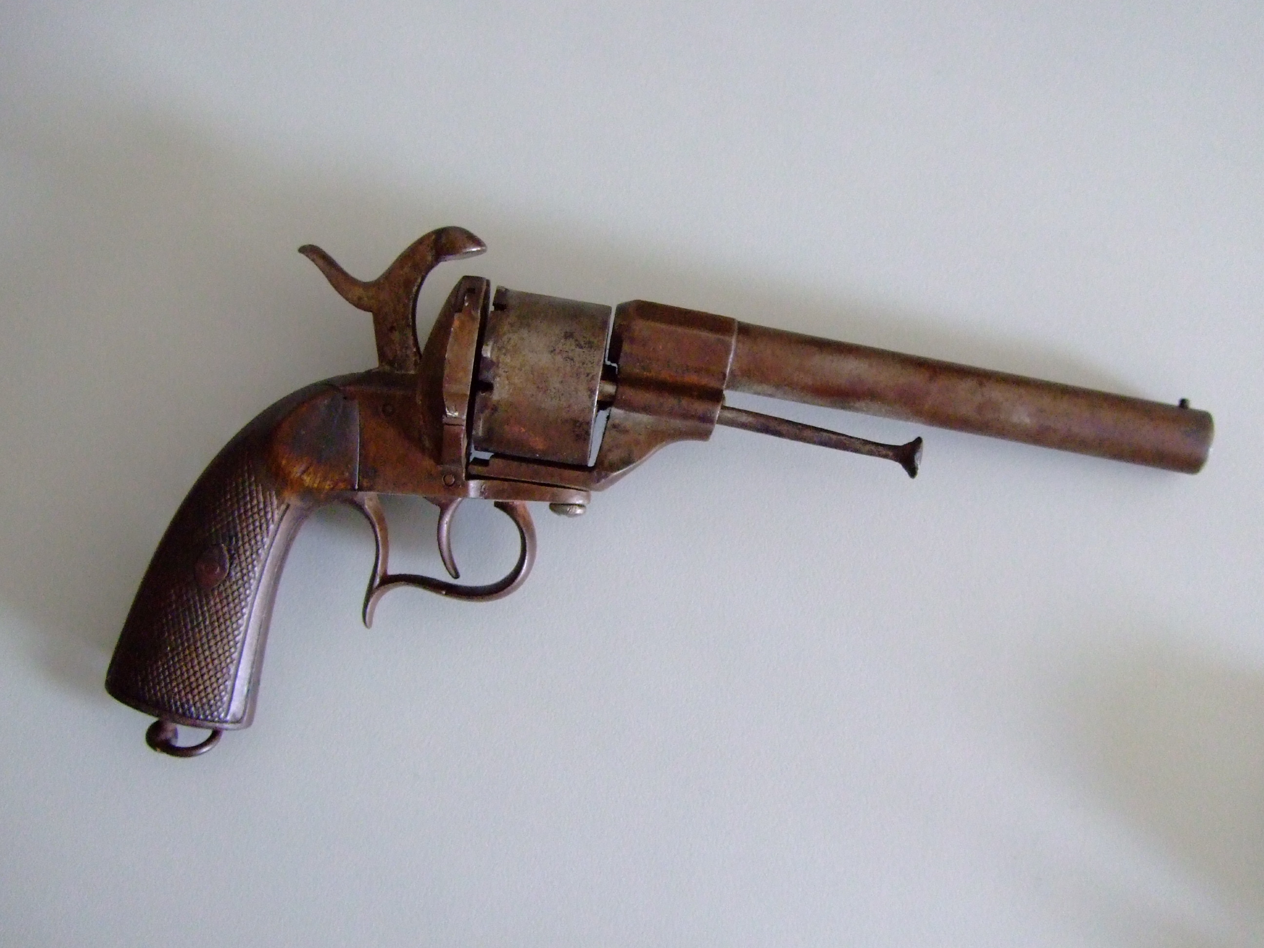 Pues tiene toda la pinta de ser un revolver francés tipo LeFaucheux modelo 1854, de 11mm y 6 1/8 pulgadas de cañón. Se usaron mucho en la Guerra Civil americana, y su valor ronda los 1000-1500 dólares USA.