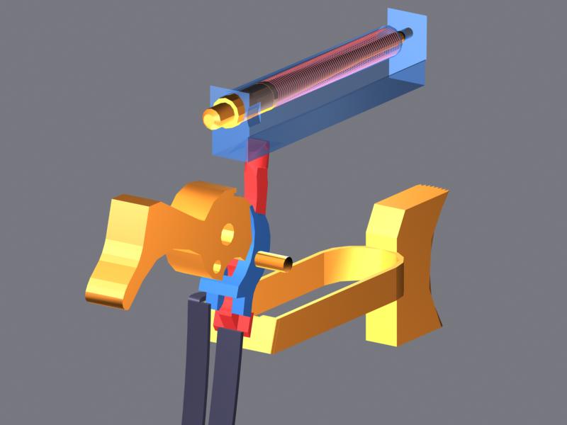 La pata izq. del muelle, acciona el fiador (sear), encargado de soltar al martillo, y la pata dcha. acciona el desconector de disparo, encargado de hacer que el arma dispare, solo cuando la corredera este totalmente cerrada.