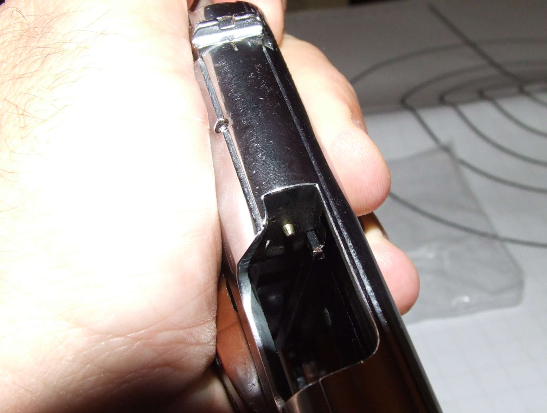 Hola, tengo una pistola del calibre 9 corto que marca los pistones de una forma peculiar, "creo", que percute correctamente el pistón y que por algún movimiento o "algo", le produce como un canal en hacia el exterior. He observado la aguja percutora y parece correcta, perfectamente cilíndrica y punta lijeramente redondeada. Lo único que le he observado a esta pistola, es que su aguja en un poco más larga que otras que he observado y que si al martillo le diese tiempo a empujarla hasta la rasante, su cabeza asomaría un milímetro más de lo normal, aunque no creo que esto tenga algo que ver. No se si esto puede llegar a ser un problema o no, pero bueno, la pistola funciona perfectamente y le tengo bueno aprecio por ser muy fiable, que recuerde no se me ha encasquillado nunca y esto para mi es MUY IMPORTANTE.