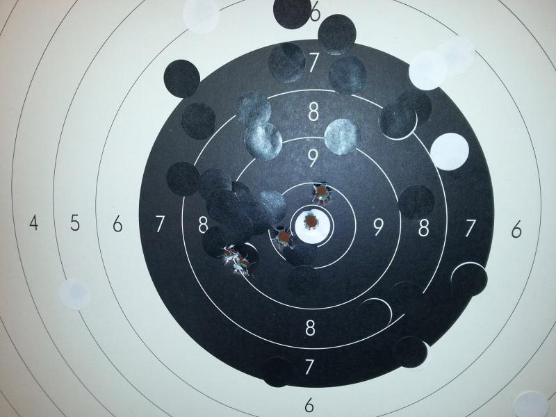 Aqui una tirada con la Steyr M9 en galeria de tiro.. 5 cartuchos , 20 metros, deciro que lo mio no es el tiro de precision, asi que si yo hago esto, vosotros imaginaros.