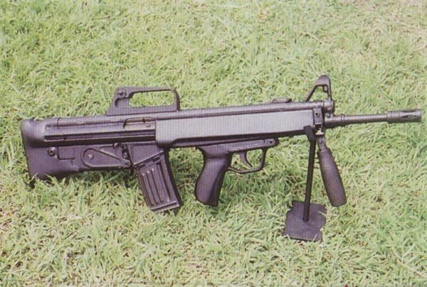 tiene la parte de delante del g3, mirilla y el asa parecen del m-16, la parte de atrás parece del fusil británico que ahora no recuerdo