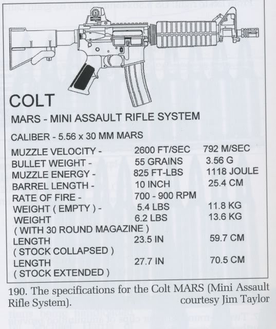 Magazine articles have also pictured or alluded to: 40-grain Blitz bullet, 40-grain VMAX, 62-grain SS109, 45-grain APDS (appears to be Armor Piercing Discarding Sabot). The label from a container of Ball loaded on R-P brass states PROTOTYPE COLT MARS CARTRIDGE CALIBER 5.56 CASE n/a BULLET TYPE W/W FMJ BULLET WEIGHT 55 POWDER TYPE 680 POWDER WEIGHT 15.8 PRIMER TYPE 7 1/2 SEATING DEPTH n/a VELOCITY n/a WARNING: LOADED ONLY FOR COLT MINI ASSAULT RIFLE AND NOT FOR USE IN ANY OTHER FIREARM. The next step in taking advantage of the MARS system was to be the development of same-length larger caliber rounds for close range, rapid incapacitation situations. Before the project was shelved two rounds had been prototyped which, in test barrels, developed the high pressures required to potentially operate the mechanism. Both rounds are loaded on Starline *---* 10mm MAG brass. The 9mm round has just enough neck to hold the 124-grain bullet, thus maximizing powder capacity, and is loaded to the same overall length as the 5.56 round. The 10mm round has a blunter, 180-grain bullet. It has been observed in loaded and no-primer dummy configuration. A partial label from the latter states PROTOTYPE COLT MARS CARTRIDGE CALIBER 10mm CASE Starline BULLET TYPE TC POWDER TYPE n/a PRIMER TYPE n/a VELOCITY n/a WARNING: LOADED ONLY FOR COLT M... RIFLE AND NOT FOR USE IN ANY OTHER ..... A duplex load with two 130-grain bullets was discussed but not seen.'