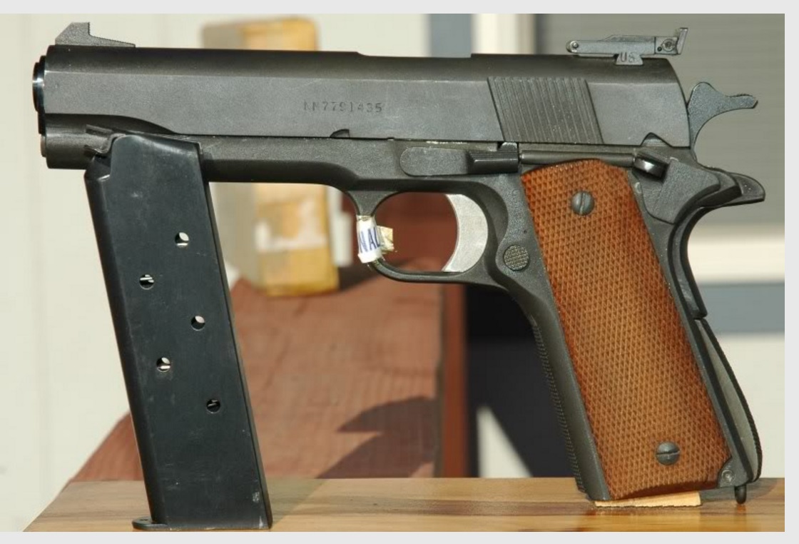 Esta es una Government Property en la que, por requerimientos de contrato, no puede haber armas de ajuste tipo National Match. Además, llevaría los marcajes de Colt, con todas sus patentes, y eso que se ve en la foto es el único marcaje de la corredera.