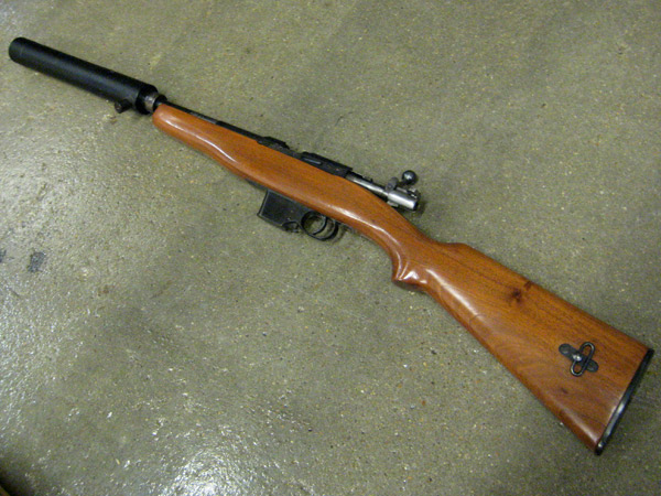 la Carabina Destroyer, en 9 largo, como no. Se le adapta un silenciador, el fabricado por MAC (Military Armament Corporation), los de las MAC 10 o "marietas". Y esta carabina fué usada por diferentes fuerzas especiales.