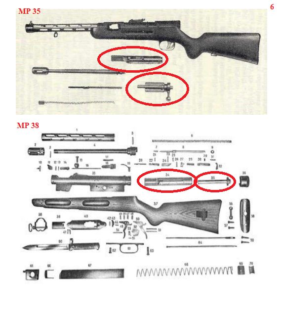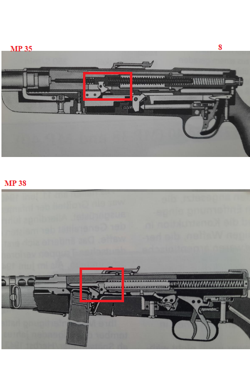 Aunque no aporto fotos es fácil de apreciar en cualquier publicación que el cajón de mecanismos por donde discurre el cierre está completamente aislado del exterior en las dos armas. El MP 35 se arma con una palanca tipo de cerrojo de fusil y en el MP 38 la palanca de armado no acompaña al cierre en su desplazamiento. La idea para las dos es aislar el cierre y el tubo por donde se desplaza de los elementos externos que igualmente encontramos en el subfusil Suomi finlandés.