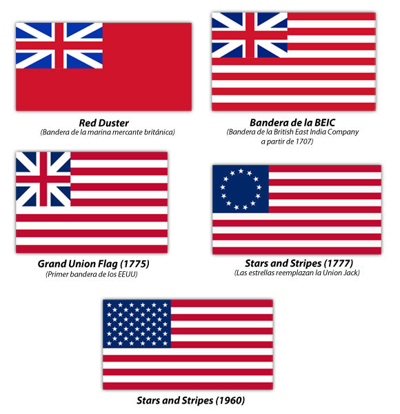 Boston Tea Party De todas maneras, hay quienes argumentan que el agregar líneas blancas a la “Red Duster” -bandera de la marina mercante británica- era normal en las colonias (de hecho la bandera de la Compañía nacía a partir de la anterior). No obstante, y como lo sugirió en 1937 el laureado historiador británico Sir Charles Fawcett, lo más probable es que Estados Unidos efectivamente basara su bandera en el diseño de la bandera de 1707 de la British East India Company, ya que el mismo era respetado por su poder y además, por ley, la Compañía no podía izar su bandera fuera del océano Indico. Y además, si bien Estados Unidos justificó que las trece barras blancas y rojas representaban a los trece estados originales de 1776, esto era una redundancia ya que los estados estaban representados en las estrellas.