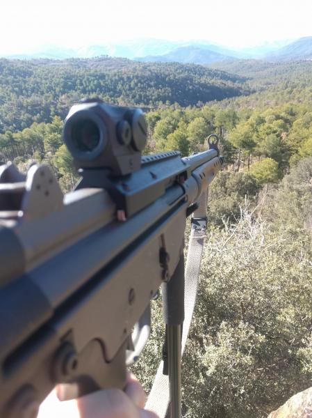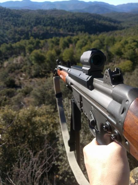 Anteriormente lo tenía con una montura stanag y un visor de aumentos regulable (el típico vaya) el caso es que no me gustó para el cetme el visor y menos la montura stanag, tengo el cetme arañado y con marcas de las garra. Total que escogí ponerle una montura (ahora pongo fotos) de tipo picatini, no me dejé los 200€ que me pedían por la hecha específicamente para cetme, opté por algo más ligero y que abulta mucho menos. Mi experiencia es que estoy contento pero tengo los siguientes fallos: el cetme a diferencia de los g3 tiene en la parte trasera en el armazón según te acercas al alza una parte rectangular que dificulta enganchar nada diseñado para g3 y si adelantas el carril , al menos a mí me queda una pata que se mete en la expulsora. No sé qué hacer. He probado con el carril y la verdad me gusta, abulta poco y es pequeño pero al quedar una pata en el aire acaba por moverse con el peso del punto rojo. Había pensado en poner goma entre el armazón y las garras para que agarre mejor o soldar el carril al armazón para dejarlo fijo, esto me da más miedo. No sé ....¿cómo lo veis?