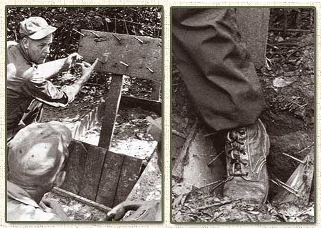 Llega el soldado, pisa donde el agujero y mete el pie, pero pisa también el cordón y arrastra las dos tablas hacia abajo, de modo que las paredes del mismo las cierran la una contra la otra con las puntas enfrentadas, y pillándole la pierna a la altura de la pantorrilla.