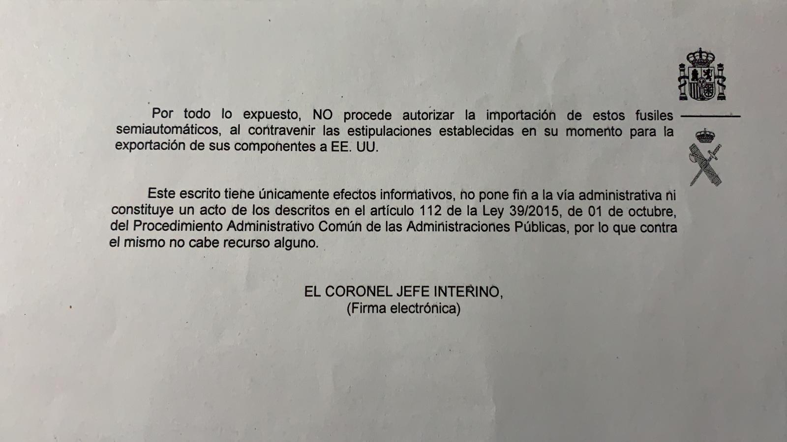 Desde mi mas absoluta ignorancia, no se puede contestar a ese escrito indicando que tiempo atrás se exportaron armas de orígen militar a otros países y esas mismas se importaron de nuevo sin modificaciones de nuevo al mercado español para su uso civil, no tiene sentido, bueno en este país no tiene sentido nada.