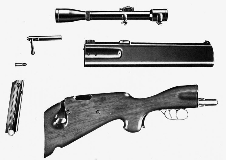 Más adelante continuaré con el apasionante tema de los fusiles de asalto en 7,92 Kurtz, que vieron servicio activo hasta los años 70. Aquí os muestro un arma muuuy poco conocida, la carabina silenciada SDK, utilizada por la Gestapo. El calibre es el 9mm Parabellum, y parece que usaba los mismos cargadores que la Luger P08. El rifle se puede desmontar para su ocultación, por lo que se supone que se utilizaba como arma para asesinato.
