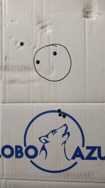 El grupo de abajo está a 5cm por encima del centro del círculo, estoy pensando en darle 2 clicks abajo (1/2 MOA cada click), ¿que opináis? Tengo dudas, también por la altura del visor que es bastante, está a 8cm del cañon (de centro a centro), y no se como ira el tema de la caída tanto a mas distancia como a menos. 1 click a la izquierda si que se lo voy a dar.