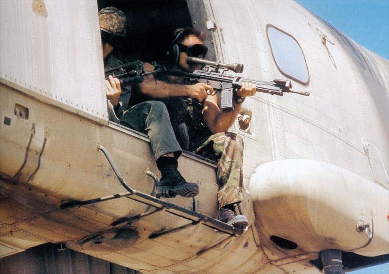 acá hay una, igualmente yo los vi en un agusta bell, este es un ranger o algo por el estilo, el aug con trijicon. caza vainas, (como de be ser)casco protec etc