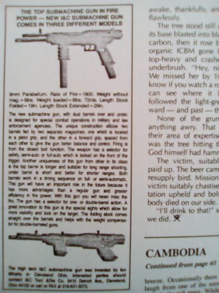 Adjunto la foto de un anuncio del típico arma extrema americana de, según dicen, 1800 disparos por minuto en 9 Para. Es como dos armas en una. El anuncio estaba en una revista de "Sordiers of Fortune" de 1990.