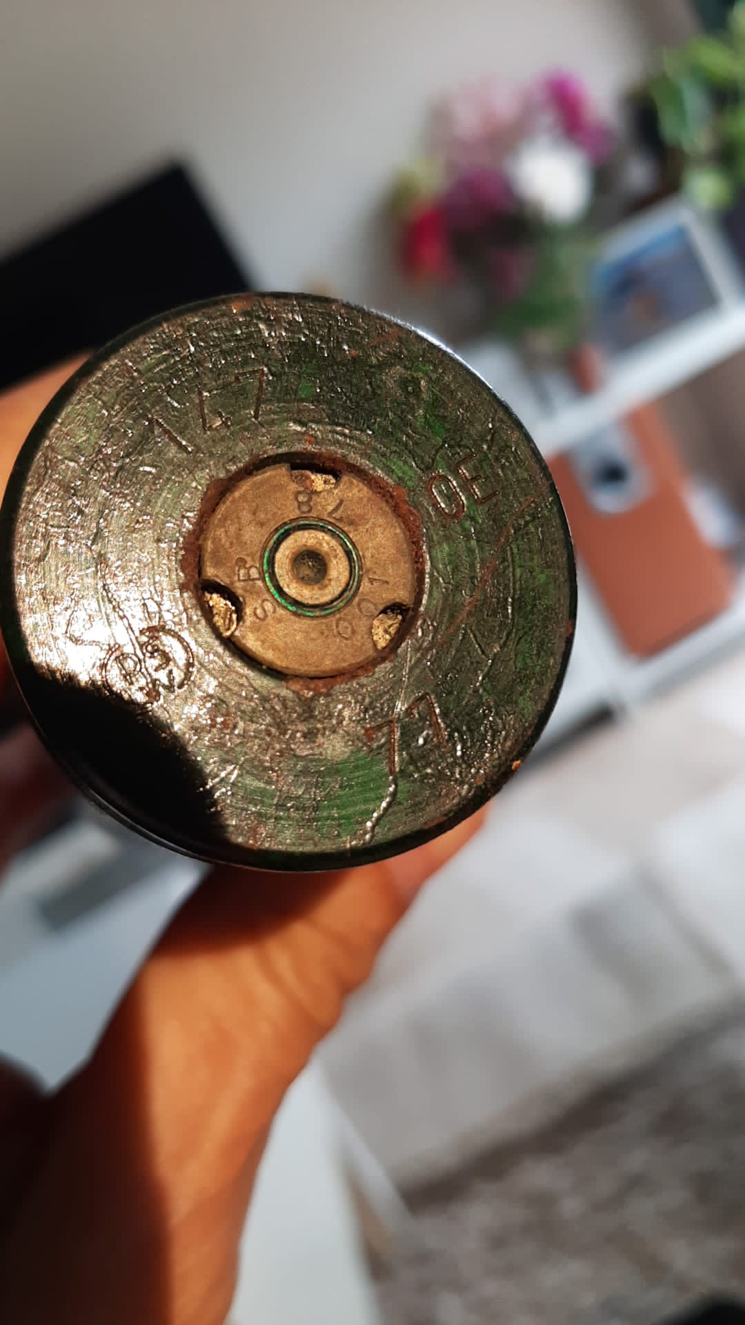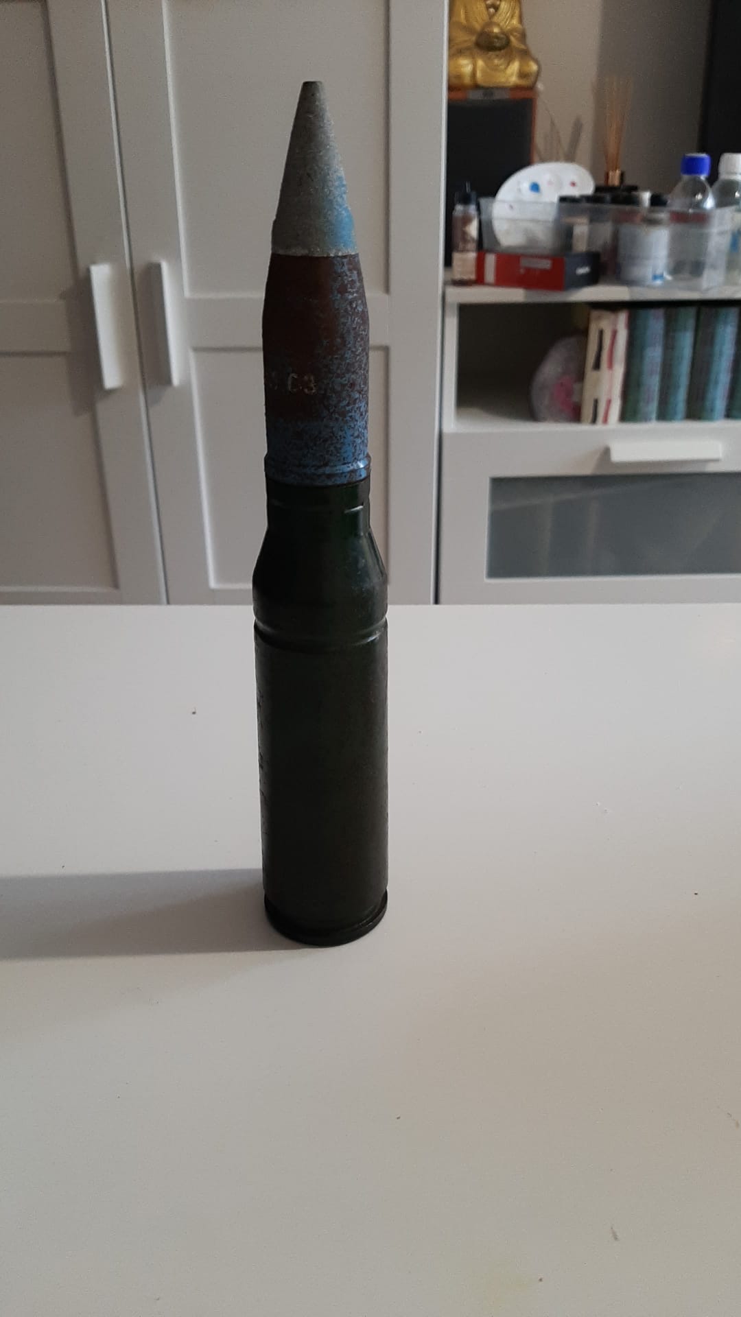 El proyectil parece que tiene restos de pintura azul, así se pintaban los proyectiles para instrucción, sin carga explosiva.