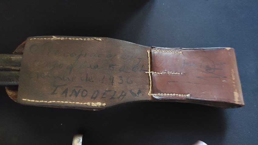 En la funda de la bayoneta, se ve por detrás una inscripción con firma que alguien hizo en el 36. Doy por hecho que en la Guerra Civil, que debían firmar la recogida de armamento o algo similar.... no????