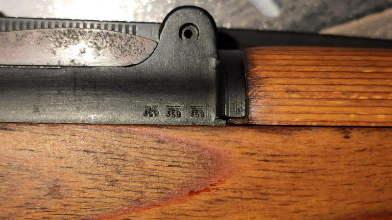 El 359 y el 37 son los sellos de inspección correspondientes a ese fabricante en ese año. Son marcas originales correctas a ese fusil. La "i" bajo la numeración del arma es el sufijo de producción. La "K" y el 4 en la pestaña para sacar el cerrojo, son correspondientes a Berlin-Sühler Waffenwerke, Suhl, 1937-39. Y el 93 los dos últimos digitos del numero de serie del K98 al que pertenecia esa pieza. El águila con la "N" es el sello del banco de pruebas aleman de posguerra. Lo que hay a la izquierda del "8AF" es el sello de importación de Baviera, también de posguerra y el "8AF" no recuerdo ahora mismo pero también es una marca de posguerra.