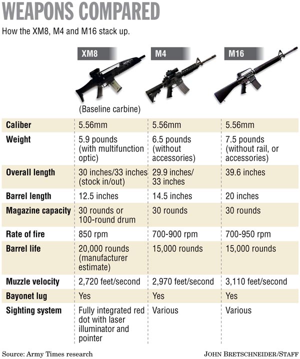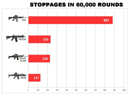 estos yankis son la leche vamos yo entiendo que el xm8 y el g36 son lo mismo cambiandole el tunning y el color,otra causa de las interrupciones no es la propia arma en si.. son los cargadores stanag del m16 m4 que no son muy fiables(se ven que aun no conocen los magpul-lancer,hk highr reability..)en fin las evaluaciones siempre son subjetivas si no las hace uno mismo..en muchos videos vemos las perrerias que les hacen y siguen funcionando,yo opino que los yankis equiparan a los m16 m4 con kit de piston de gases,(el osprey tiene muchas puntos dado que apenas se realizan cambios significativos en el arma)y es mas barato segun esta la economia que cambiar todo un ejercito de arma..si no el tiempo nos dirá.