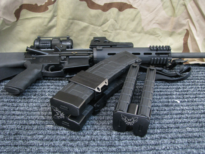 También estoy encantado con el clip de unión de los cargadores de la segunda foto, aunque todavía no he descubierto el fabricante, a lo mejor tú sabes algo. Por ahora los dos únicos que he encontrado que me convenzan son de RAINIER ARMS, y de SPRINGER PRECISION, este último fabricado especialmente para los cargadores PMAG de 30 tiros. Echa un vistazo a las fotos que es una caña.