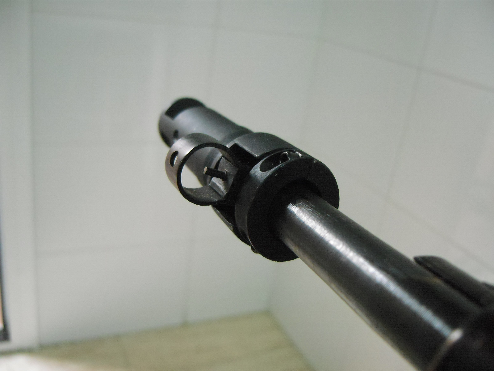 no sé si es problema de los gases, que al comportarse de manera distinta en su salida afectan a la bala y a su precisión o es que la bala roza con alguna parte metálica de la estructura del freno de boca y la desvía. No sé... Respecto a lo último tomé la precaución de antes de disparar, saqué el cerrojo y miré a través del cañón y no se veía estructura alguna que entorpeciera la salida de la bala. En fin...