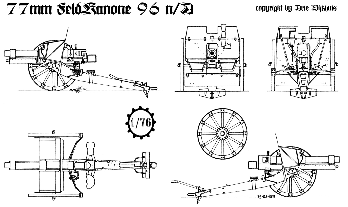 En 1896 Alemania adoptaba este cañón de 77mm dispuesto sobre montaje rígido aunque incorporaba, para absorber el retroceso, arado elástico y freno de cuerda. Posteriormente en 1905/06 se le doto de una cureña de largo retroceso con los frenos y recuperadores adecuados. De ahí el "NA" en la denominación del nuevo modelo. Alemania suministro 100 cañones en octubre de 1938 formando parte del pedido 1725 hecho a la HISMA. Con anterioridad figuraron algunas piezas de este modelo en el Ejército Nacional, procedentes de capturas hechas al enemigo. La mayor parte fueron al frente del Ebro ante la urgencia de material por el excesivo desgaste de los 77/32.