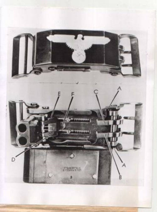Sin ánimo de ofender, sobre que el arma de la "hebilla" funcione o no, no opino ya que podría ser un arma real, pero que es una falsificación inventada de postguerra seguro, nunca he visto una en una foto de época ni en ningún libro, los codigos de fabricante son inventados 100% y encima es hortera a más no poder y como tantas falsificaciones de fantasía cuanto más nazi se vea mejor. Lo raro es que aparte de ponerle un aguila de gorra de las SS no tenga una figurita de hitler que cuando levanta el brazo dispara.