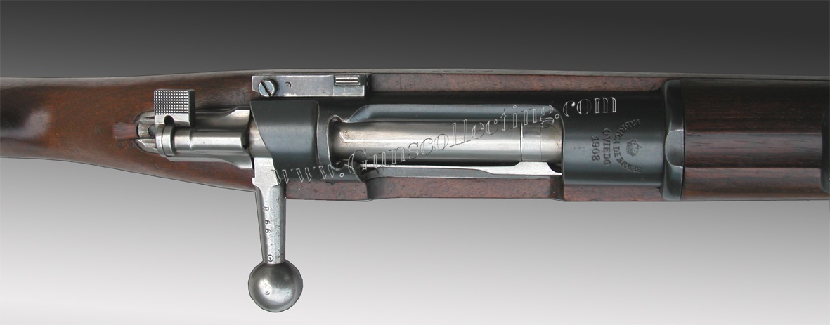 Mauser Oviedo 1916, fue el fusil reglamentario del Ejército de 1916 a 1943; la maneta del cerrojo es curva igual que la de la foto y el alza es similar.