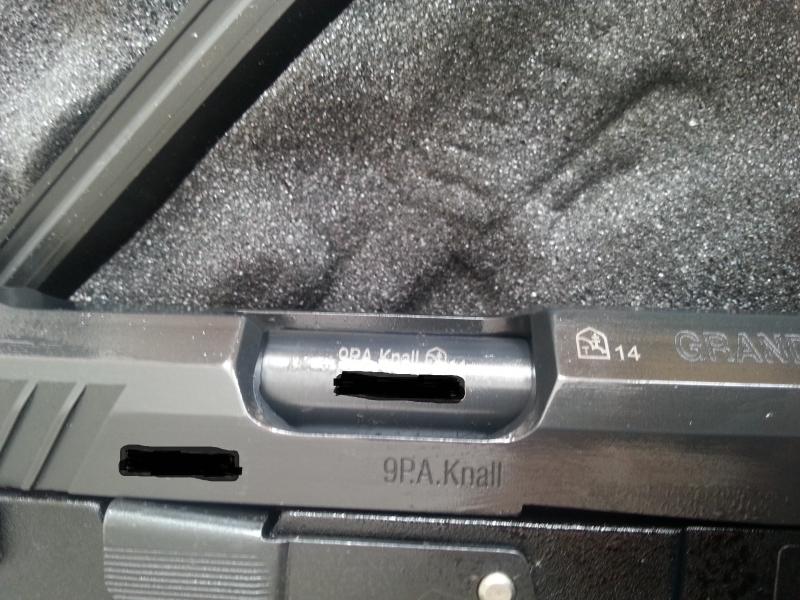 como pueden comprobar lleva marcaje reconocido por el banco de pruebas español, el del calibre 9 mm PA knall, en el lateral GAS ALARM