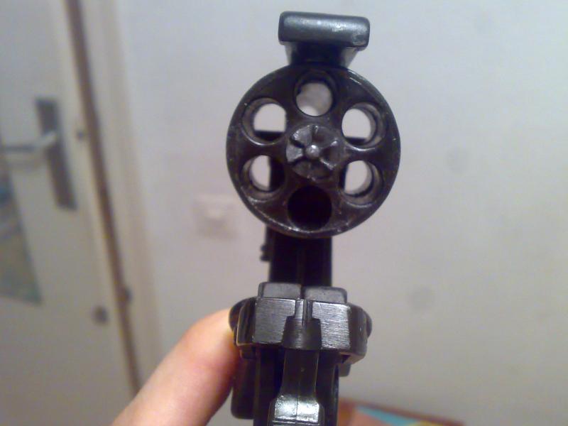 El calibre no se corresponde exactamente con el del arma real. En ésta réplica los agujeros del tambor miden 9mm y para que no se pueda meter nada están taladrados desde ambos lados dejando una rebaba en medio. Se intuye en la foto.