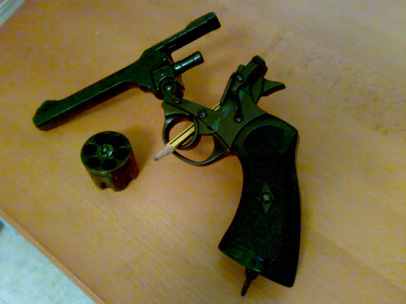 El tambor gira cada vez que apretamos el gatillo pero no tiene la pieza inferior que lo retiene durante el disparo. El resultado es que en el momento del disparo no siempre coincide el agujero del tambor con el cañón.