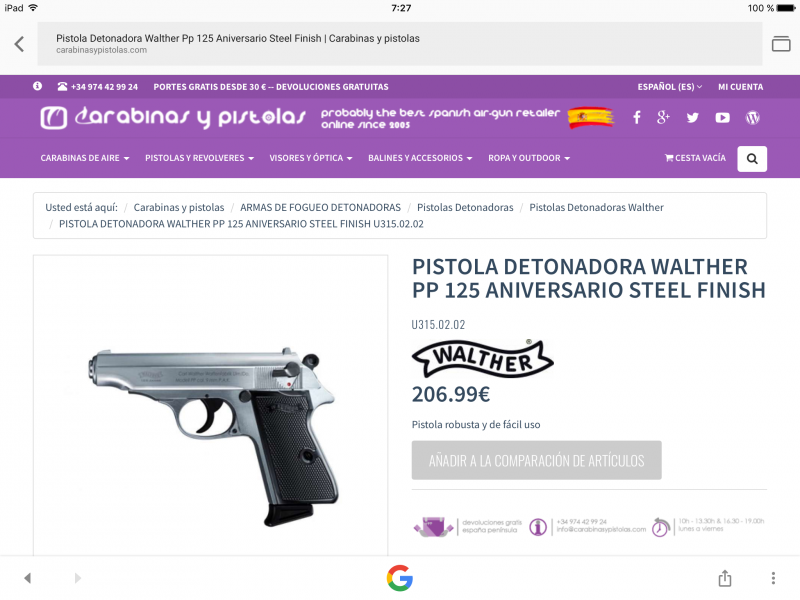 Buenas noches o buenos días a todos, ¿conocéis a este detonador walther pp calibre 9mm PAk versión 125 aniversario? Me parece que es de acabado acero, he visto en una tienda online español que vende este modelo, pero en Google imagen o por el YouTube no encuentro nada relacionado con esta detonador, ni si quiera encuentro un foto hecho por otras personas de esta pistola, ¿sabéis si existe esta pistola PP detonador hoy en día y que se pueda comprar? o es solo una mentira para engañar a la gente