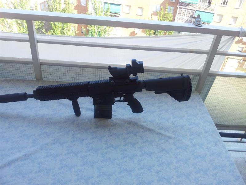 Pues aqui les dejo unas fotos de mi última adquisición airsoftoril un HK417 al que le he puesto un visor ACOG4x + Micro Red Dot , Grip Vertical y silenciador. A ver que les parece.