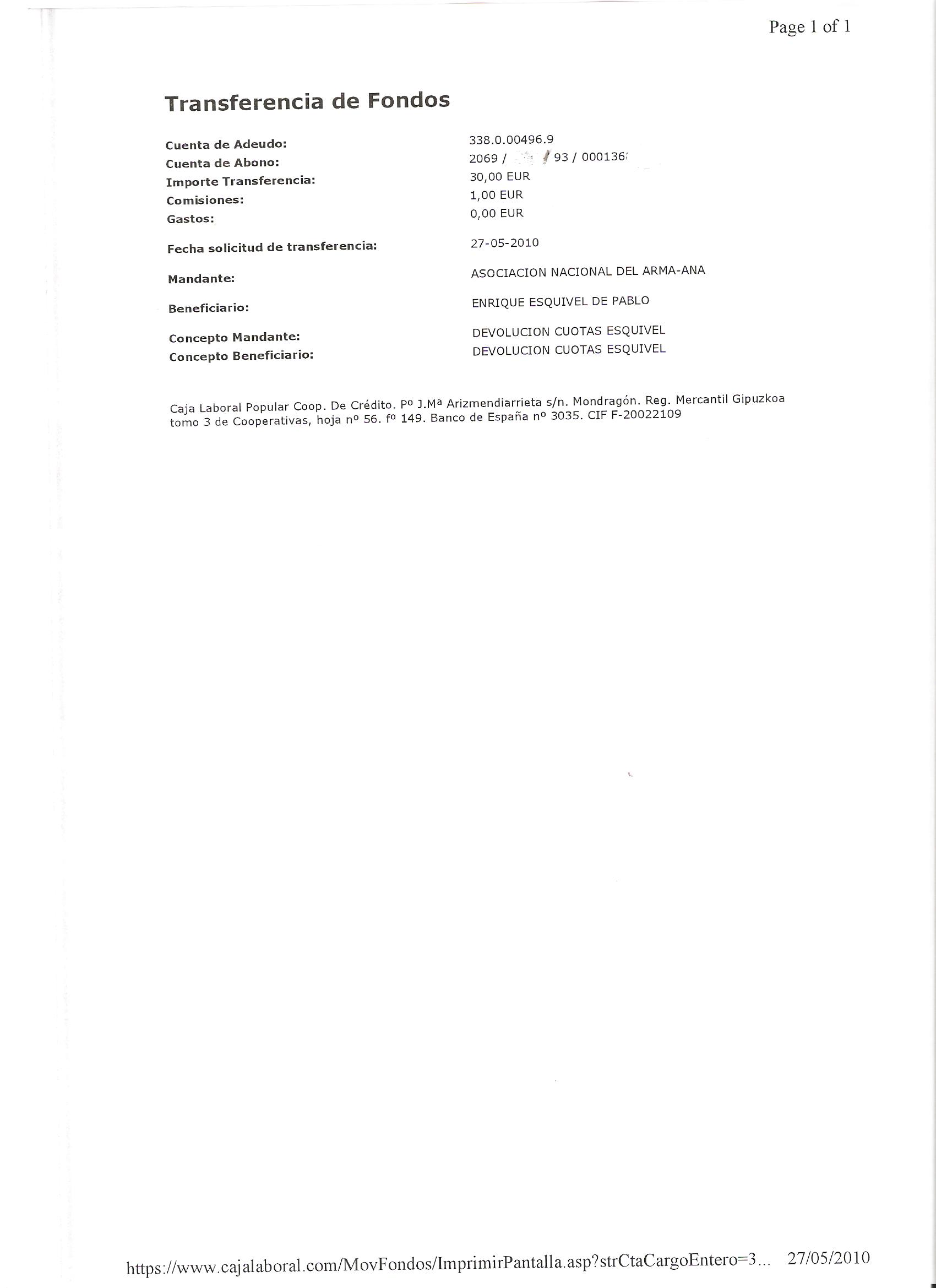 Este es el recibo de pago mediante transferencia de la cuotas que A.N.A voluntariamente a devuelto, aún después de haberse vertido graves acusaciones contra mi y contra A.N.A, OJALA LOS ESTAFADORES DEVOLVIERAN EL DINERO TAL Y COMO HA HECHO A.N.A.