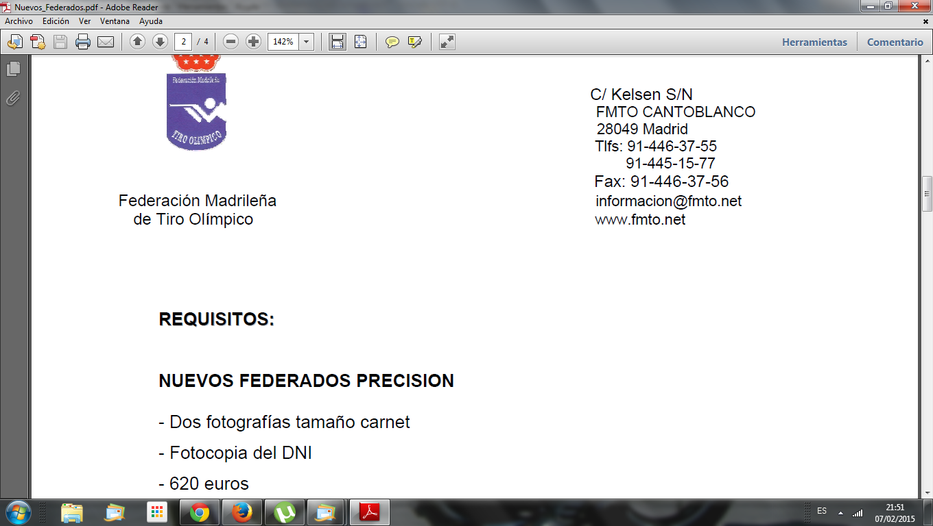 oscashooter escribió:DALTON escribió:Ojo con lo de la licencia única en Madrid debes de rellenar un formulario para que se lo manden a la Nacional para que te inscriban en el registro como tirador de tu comunidad aquí os dejo el enlace al documento de la FMTO que deberemos rellenar los que estamos federados en Madrid, supongo que las demás comunidades autónomas deberán hacer lo mismo.