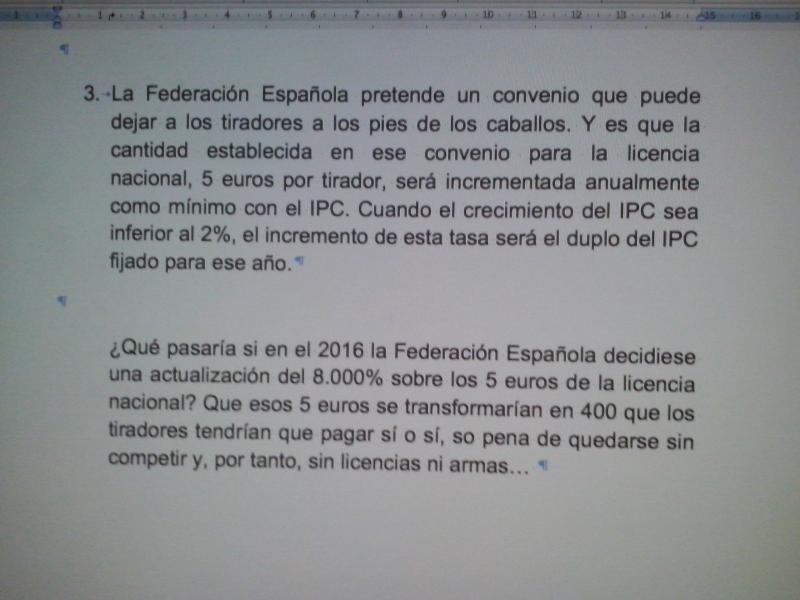 Esta es parte de la carta que se le remitió hace casi un año al presidentente de la Federación Vasca, Patxi Alonso Peskera, alertándole, sin éxito, del riesgo que conllevaba para el bolsillo de los tiradores de a pie suscribir el convenio de adhesión a la licencia única en los términos que planteaba la Española (con cláusula suelo pero sin techo para la revisión anual de su precio):