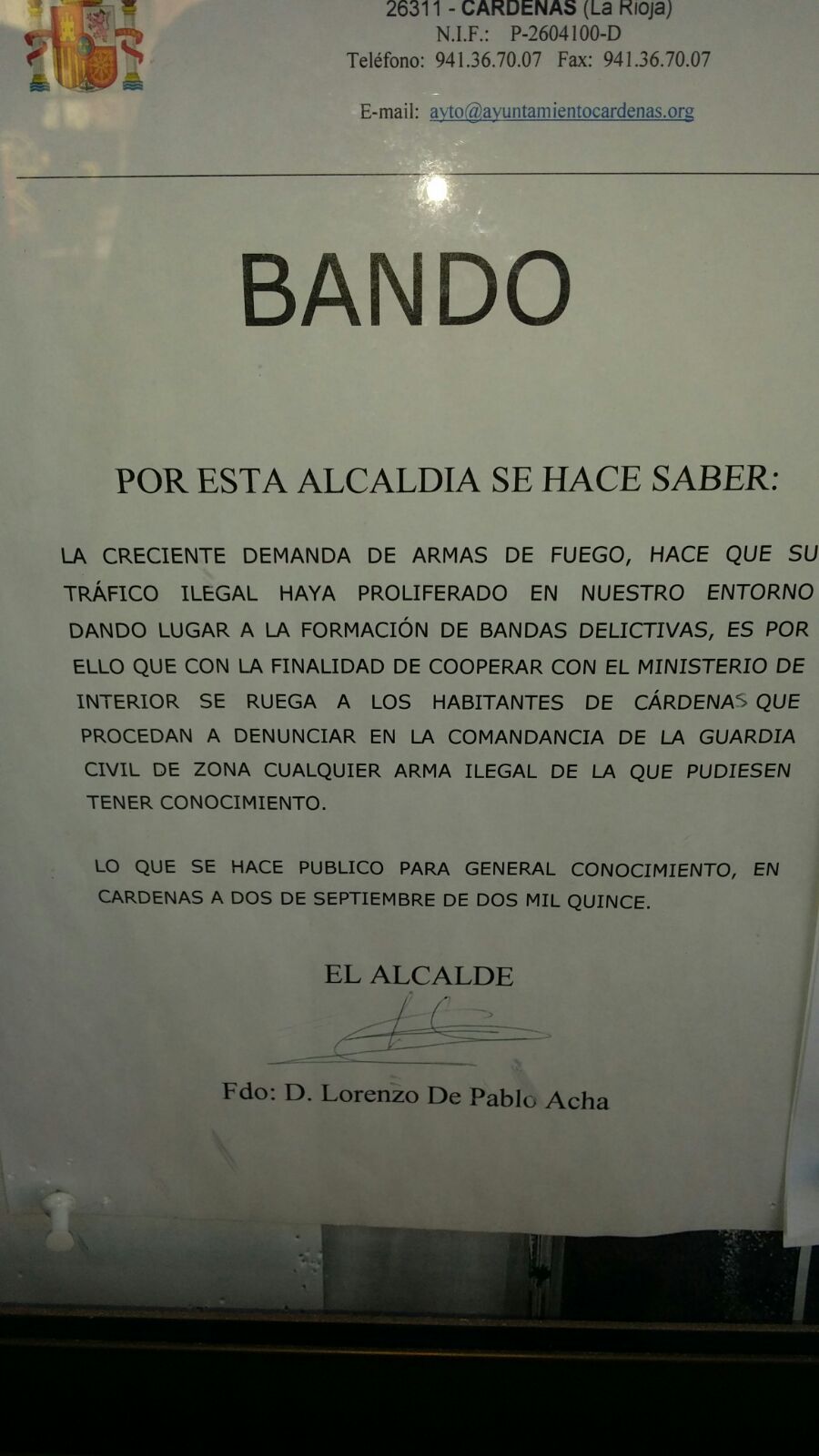 El "pero" es que el bando es alarmista respecto a las armas . Estoy además seguro que la supuesta proliferación de armas ilegales, en ese pueblo y su entorno, no se basa en datos objetivos y que solo creará confusión entre los vecinos.