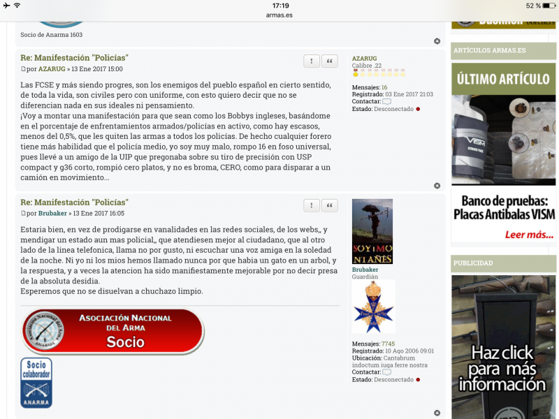 Shoot , tiene razón cuando dice que en este foro (Y en otros muchos,para qué vamos a engañarnos) hay cierta animaversión hacia las FCSE. Yo mismo así lo he sentido más de una vez y hasta vergüenza he sentido por lo aquí leído (En el foro, que no en este tema). Es algo que se puede demostrar y que por desgracia no ha sido algo exporádico; por suerte se trata de una minoría de miembros de este foro. En la mayoría de los casos y ocasiones se defiende y apoya la dura y dificil tarea que ustedes realizan.