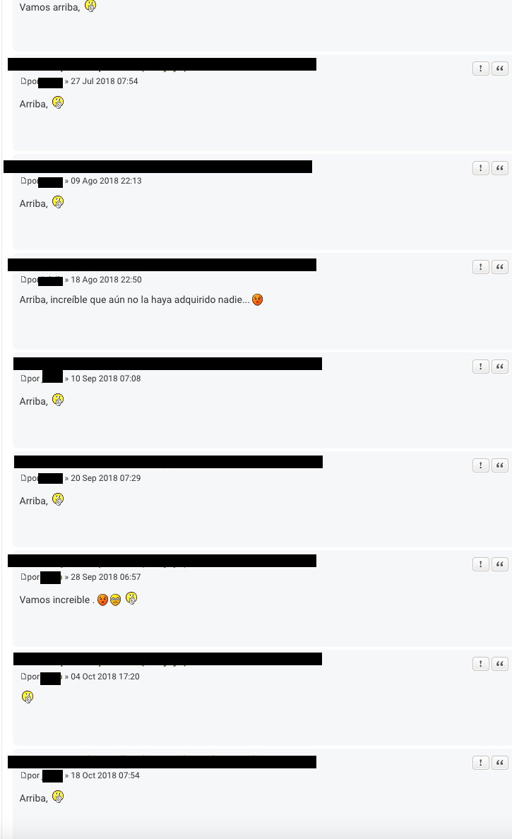 Otra cosa podríais regular de alguna manera compra-venta ya que es muy molesto los "up" ya que hay usuarios con varios mensajes de cosas que llevan ya tiempo sin venderse y se dedican a subir todos sus post de golpe haciendo bajar a algunos más nuevos que pueden resultar interesantes a otros usuarios. En otro foro en el que participo para evitar esto obligaban a que si querías hacer "up" había que bajar el precio obligatoriamente o incluir otras cosas. Lo digo porque hay post que después de el inicial tienen varias páginas con solo "up's" del creador del hilo