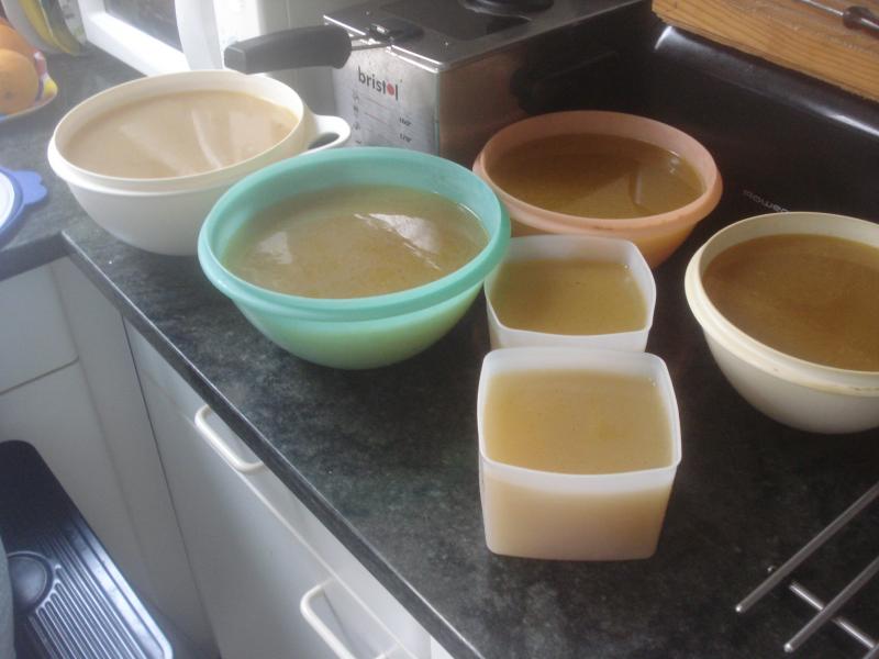 En este puchero que os muestro he puesto a cocer tres (3) traseros de pollo, pata y contramuslo, una docena de puerros hermosos, no hay que escatimar, 1Kg. de zanahorias y unos dientes de ajo sin pelar, durante toda la noche se pone a hervir a fuego lento y este es el resultado.