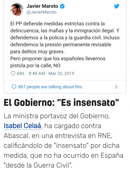 La reacción virulenta de los demás partidos solo confirma que va en la buena dirección. Tergiversan lo que ha dicho sobre la defensa propia. Odian que el ciudadano sea libre y responsable. En fin, lo que siempre hemos comentado en tantos y tantos hilos.