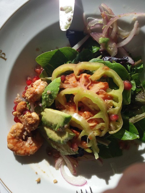 Ensalada de tomate huevo de toro, brotes, langostinos adobados y granada.