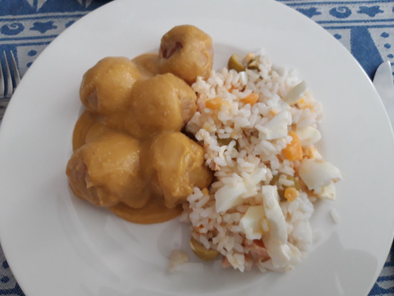 Albóndigas de pollo, con arroz "divertido" (arroz blanco con huevo duro, atún, y aceitunas).