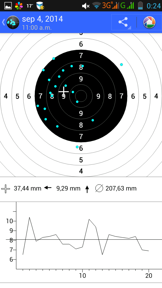 Veo que no habeis puesto para android myshots. Pones cada disparo donde ha impactado y al final te dice el diametro de agrupacion, la puntuacion electronica aproximada, el centro de la agrupación etc.