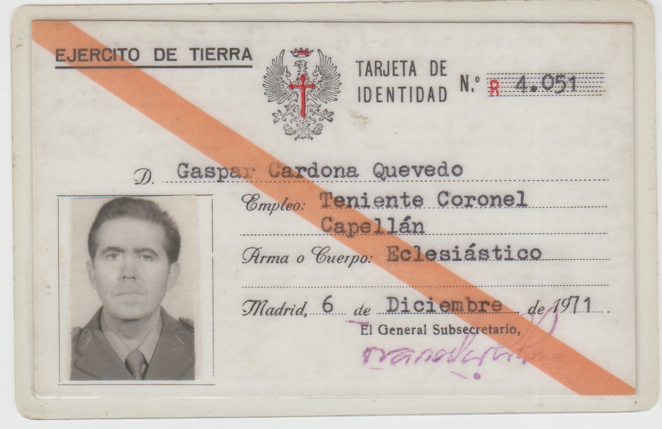 Se trata de un carnet militar de ejercito de tierra del sacerdote Gaspar Cardona Quevedo
