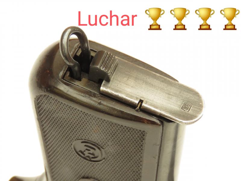 El cargador se sujeta mediante el clásico, y muy extendido en la época, enganche en la base de la empuñadura.