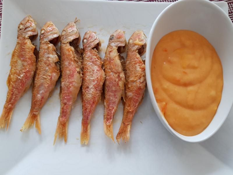 Hoy, salmonetes enharinados fritos y guarnición de puré de patatas con zanahorias casero, todo guisado con aceite puro de oliva, imprescindible en mis comidas, para ensaladas, aceite primera extrusion en frío. La mantequilla para Marlon Brando.