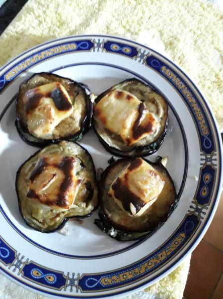 Por cierto, hoy ha tocado "Emparedado de berenjena relleno de espinacas con queso" al horno.