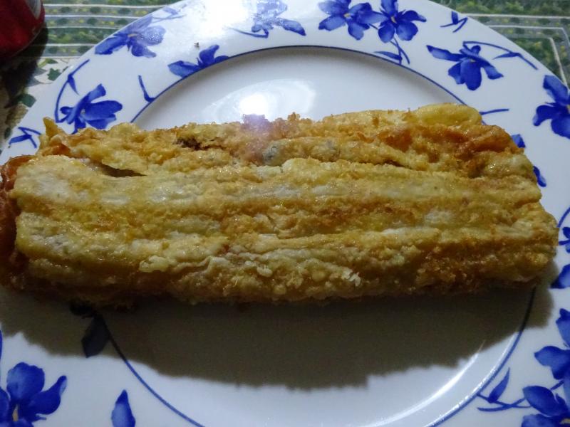Ahora ponemos en un bol tres cucharadas de Maizena, una yema de huevo y se completa con agua CON GAS muy fría, se bate hasta conseguir la consistencia deseada, ni muy liquida ni muy espesa, se pasan las colas de las gambas por el mejunje y se frien en AOVEX calentito, cuando se han dorado se sacan y se colocan en una fuente con papel Cologar para quitar la grasa sobrante.