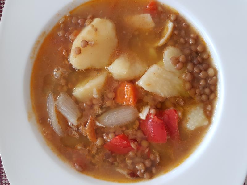 Hola, hoy humildes lentejas vegetarianas cocidas, que no guisadas, con patatas, tomate, cebolla, ajo, pimiento rojo, chorrito de vinagre de Jerez y aceite de oliva