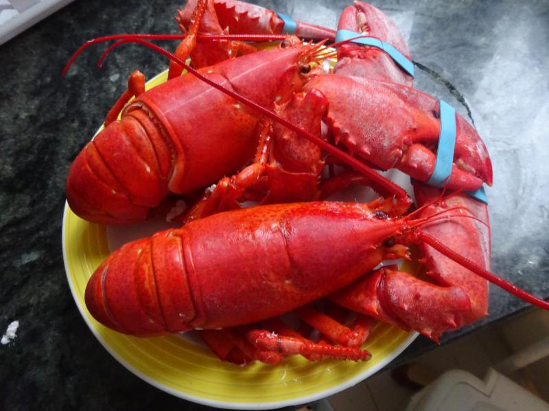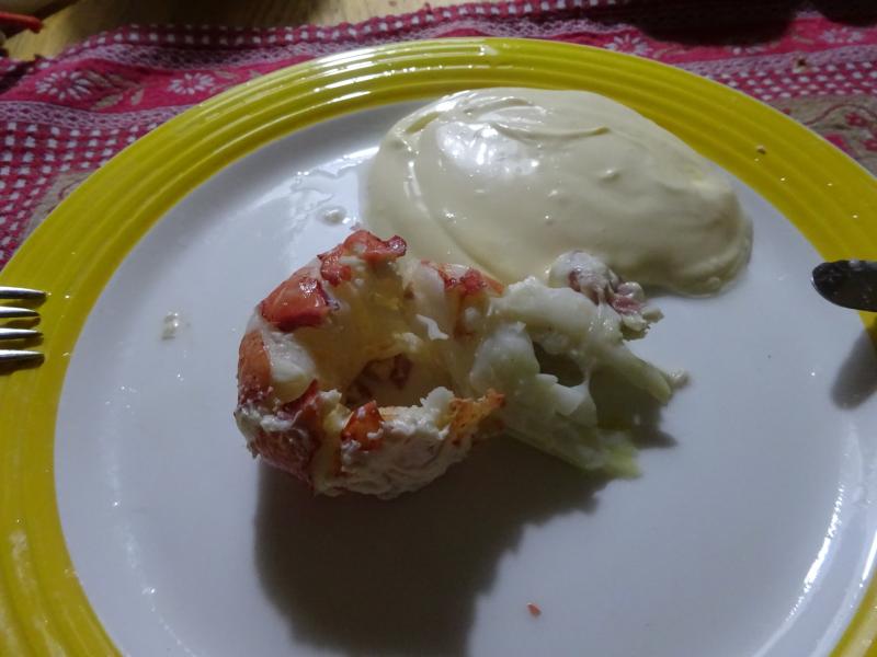 Bogavantes canadienses cocidos en agua de mar con puñadito de sal marina y aliñados con mayonesa casera, me hubiera gustado más hacerlo con bogavante de Castro pero mi economía de jubilado pobretón no me lo permite, salvo que lo pesque yo claro, pero no es el caso.